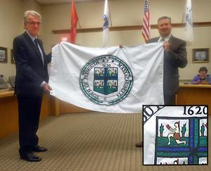 A colorfully embroidered flag recently installed in the Mayflower Room at Town Hall offers much more than meets the eye, for those who care to take a closer look. It’s the official town flag of Plymouth, unveiled to the public at the most recent meeting of the Board of Selectmen. It replaces an unofficial flag that has been displayed in the Mayflower Room, where the selectmen meet, for as long as most staffers can remember. This present, official town flag has actually been around for 17 years.