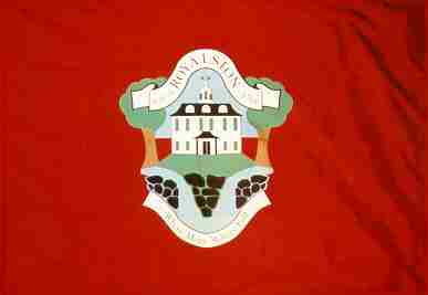 A red flag with a shield-shaped device at the center consisting of a white house in the center, two trees on the side edges, a white ribbon bearing the town name above, a stone wall and waterfalls and a white ribbon below stating "WHERE MANY WATERS FALL". Royalston is in Worcester County.