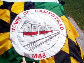 The 1st and 4th quarters are paly of 6 pieces, or and sable, a bend dexter counterchanged. The 1st and 4th quarters consist of 6 vertical bars alternately gold and black with a band on which the colors are reversed, as in the state flag. The 2nd quarter is divided per bend sinister green over yellow, the 3rd quarter divided per bend sinister, yellow over green. Overall in the center a white disk with an outer white ring bearing the name and date, and an inner white field depicting a railroad station.