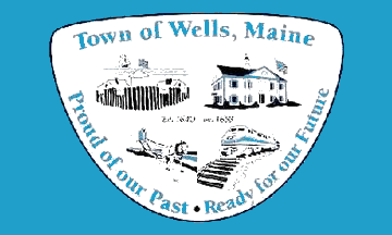 A light blue flag, containing a stylized shield showing four local landmarks. Near the top is written 'Town of Wells, Maine" and around the bottom "Proud of our Past - Ready for our Future".