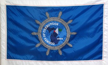 The flag is blue, white border, in the center a ship's wheel with a map of Michigan inside, on which a red dot and white arrow locates the county.