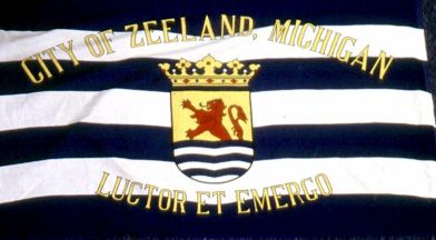 Seven horizontal stripes of dark blue and white, with a crowned shield at center. Shield is divided with a red demi-lion on yellow in the upper half and six dark blue and white horizontal wavy stripes on the lower half. Above is written in yellow CITY OF ZEELAND, MICHIGAN and below in yellow LUCTOR ET EMERGO.