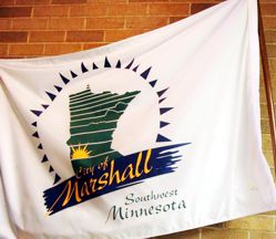 A white flag with the city logo on it - the name Marshall written in yellow on a blue swatch, and above it a map of Minnesota with a rising sun at the location of the city, all surrounded by a ring of blue triangles resembling a sunburst.