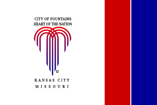 A 2:3 flag with a white square panel on the hoist side and the remaining third taken up by two vertical stripes separated by the thinnest white line, dark red and very dark blue, at the fly. Centered on the white area, the city logo with its lettering: This is a very stylized fountain gush, made from five parallel lines that curve upwards and outwards, three to each side (the middle line branches); these lines are colored in a red (apparently not dark red) to very dark blue gradient, from top to bottom. Above this emblem the words "City of Fountains" above "Heart of the Nation", and below it "Kansas City" above "Missouri", all composed in small black serif capitals, each line tightened or loosened to fill more or less the same horizontal space. Near the emblem, to its bottom and to the fly, a copyright sign, composed likewise.