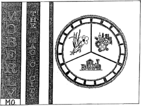 My description: Three vertical lines beginning from the hoist - the first is widest and contains "MOBERLY" and is not going to the bottom, where "MO." is placed in white square. The second is thinner and contains "THE MAGIC CITY". The third is the thinnest. They are all on about one third of all the flag. On the rest of the flag is a seal-like circle divided in three equal fields - first with a flower, wheat and corn, the second with industry wheels and a church and buildings, and the third contains a train. The official meaning: "The vertical lines suggest development. The flower represents growth. The wheat and corn represent the agriculture aspect of the community. The train is from the seal of the City of Moberly. The cog-wheels, church and building represent business, industry, religion and health care in the community. The circle represents the railroad tracks which was the birth of Moberly, Missouri, while also representing that growth is never-ending. The three lines separating the symbols indicates peace. The colors, white flag, royal blue and gold represent the Magic City, Moberly, Missouri."