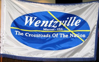 The flag of the City of Wentzville, Missouri, is white with the city logo on it. The logo is also city trademark. Logo shows an blue oval, two yellow lines crossing each other, and the words "Wentzville / Missouri - USA" and "The Crossroads Of The Nation". Flag and logo adopted by the City Board of Aldermen on 08.11.2006. Information and photo of the flag thanks to Vitula Skillman, MMC/MPCC, City Clerk.