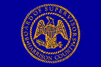 The flag of the Harrison County, Mississippi, is blue with a golden application of the county seal on it. Photo of the flag is located by Aleksandar Nemet: www.flickr.com/photos/99491151@N00/3105435561. The seal can be found here: co.harrison.ms.us/404seal.gif.
