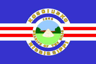 The City of Kosciusko, Mississippi, is blue with five horizontal stripes white-red-white-red-white going through the center of the flag, in the middle is positioned the city seal (or seal-like device) showing beehive. The first outer ring is white with "KOSCIUSKO" up and "MISSISSIPPI" down in yellow letters. The inner ring is white with "1834" and "BEEHIVE OF THE HILLS" in yellow letters. Photo of the flag provided by Hart Pettit, City Clerk, City of Kosciusko.