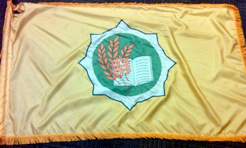 A yellow flag, with a central 8-pointed pale green shape bearing a dark green disk on which are an open book and three fronds.