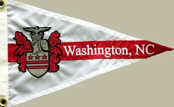 The flag of the City of Washington, North Carolina, is white with three horizontal stripes yellow-red-yellow going through the middle of the flag, interrupted by the city seal in the center of the flag. The City also has a burgee, which is white with red horizontal stripe in the middle with Washington coat of arms towards the hoist and the words "Washington, NC" in white. Image of the flag and photo of the burgee thanks to Lynn Lewis, Tourism Development Director.