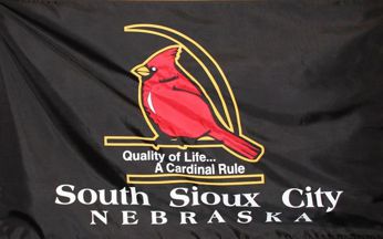 The flag is black with the city logo showing a cardinal perched on a branch above the motto and name.