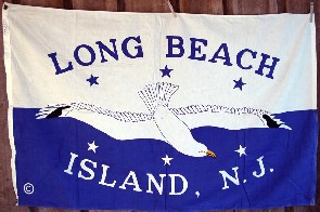 Description: horizontally divided white above blue, over the division a white gull in flight, wings having a black stripe at the tips, beak yellow, head towards the lower fly; on the upper stripe part of name in blue “LONG BEACH” above three blue five-pointed stars, all bowed, and on the lower stripe part of name in white “ISLAND, N.J.” below three white five-pointed stars, all bowed. In the lower hoist white “C in circle” copyright sign.
