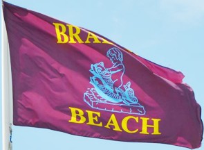 The flag is crimson with a light blue line drawing of a child playing on a dolphin, and above and below written in gold the words Bradley and Beach.