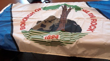 positioned the borough logo - a tree in front of a rock, with below green and white stripes, surrounded by the inscription "BOROUGH OF / GLEN ROCK / 1894". Photo of the flag thanks to Lenora Benjamin from the Borough Administration.