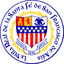The city coat of arms (at en.wikipedia.org/wiki/mage:SantaFeNMseal.jpg and in many other locations) is filled with the U.S. coat of arms (but with stars on its chief) and a chief impaled of "Old Spain" and what I supposed to be Mexico: white with a blue eagle on wreath pattern; "Old Spain" is per pale Gules and Or a castle tower and a lion rampant counter changed. At www.santafenm.gov/PhotoView.asp?PHID=136 a very large image shows a city police sleeve patch with the city coat of arms (with red eagle instead, though).