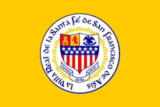 The NAVA image at www.nava.org/.../SantaFe.jpg and shown in Kaye (2004) and American City Flags shows a golden yellow flag with the city coat of arms on a large white disc.