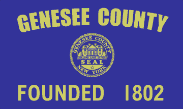 A blue flag, with the name and date of founding prominently written in gold above and below a central county seal.