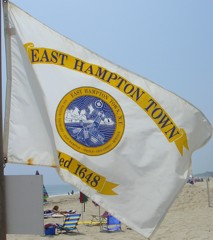 A very clear photo of the Town flag at www.flickr.com/photos/mgpix/957718874/sizes/o/. The flag is white with the town seal in the center- with an outer ring of gold w blue lettering, and an inner image of white and blue. Above the seal is a gold ribbon with blue lettering EAST HAMPTON TOWN and below the seal another such ribbon with the phrase SETTLED 1648.