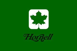 I took a picture of the flag of Hornell which happens to hang in the Wal-Mart. The flag is dark green (going by browser-safe colours it's V++), with the logo of Hornell in the top centre, a green maple leaf growing out the base of a white rounded square, reflecting it's nickname of "Maple City". In the lower centre of the flag is the word 'Hornell', in a distinctive typeface, in black italics.