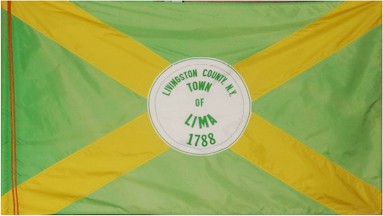 The Town of Lima has the rare distinction of having its own custom handmade town flag. It was designed, created, and presented to the town on Memorial Day 1976 by Lima's Quaere Club in honor of the United States Bicentennial. Many designs were considered before three finalists were chosen and reviewed by the Lima Town Board, the Bicentennial Committee and the American Legion who together selected the final design. The green background represents the verdant agricultural fields surrounding Lima, while the two diagonally-crossed yellow lines (the color of