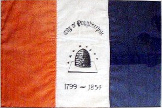 The flag of the City of Poughkeepsie is a red (or orange?)-white-blue vertical triband with city name (and seal?) on the white stripe. Photos: cityofpoughkeepsie.com/art/mayor.JPEG