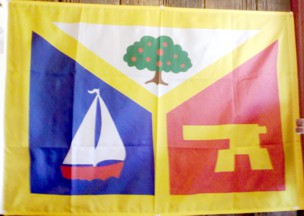 The flag is divided in three fields following the shape of the letter "Y", all bordered in yellow, including the lines between fields. The first [upper] field shows an apple tree on a white background; the second [left] field shows a yacht on a blue background; and the third [right] field shows a cannon on a red field. Photo: www.niagarariverregion.com/_images/Youngstown%20Village%20Flag.jpg from the website: www.niagarariverregion.com/chamber/webcapsule/youngstown/index.shtml.