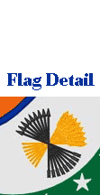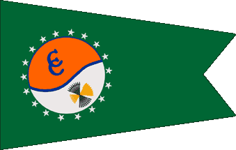The Columbiana County flag is shaped like the Ohio flag, a burgee, to associate it with something familiar. It was designed by Debbie Thorp of Salineville in 1972. The green field stands for the wooded areas such as Beaver Creek and for the hills, fields and state parks. The orange and white circle represents the pottery and mining industries, and the blue line stands for the Ohio River. White can also remind us of salt licks. The circle of 18 stars represents the number of townships in Columbiana County. 8 wheat sheaves stand for agriculture, and 9 arrows show respect to the Native Americans and to history. Added together, the number 17 reminds us that Ohio was the 17th state admitted to the Union. The county name is represented by the initials "CC." Columbiana is a combination of Christopher Columbus and Anna.