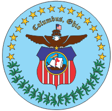The first flag of Columbus, adopted 12 February 1912, was the seal/coat of arms on a blue field. A committee convened by city council had chosen it. Although the 1912 council clearly stated that the flag, not the seal,