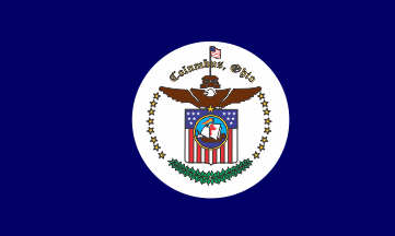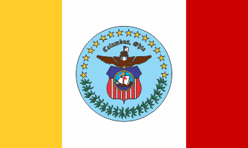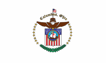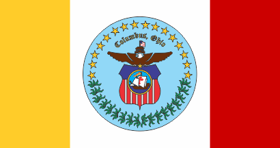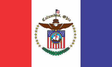Here is the photo of the flag of the City of Columbus Police Department: farm4.static.flickr.com/3235/2303380358_87d7291062.jpg. It is blue with white ribbon with words "COLUMBUS / POLICE DEPARTMENT / OHIO" and CPD badge surrounded by stars and leaves below.