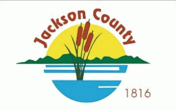 AThis white flag shows a colorful water-side scene, centering on a group of three cattails. Jackson County was established in 1816, and named for Major General Andrew Jackson, who won the Battle of New Orleans in 1815.