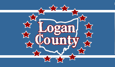 This red, white and blue flag centers on the county name. An outline of Ohio is surrounded by seventeen red stars. A white stripe goes across the top and the bottom of the blue background. Logan County was established in 1818. It was
