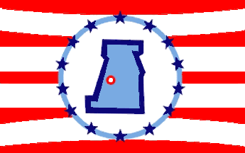 Nine horizontal, slightly curving red and white stripes, a central design consisting of an outer light blue ring with 14 dark blue stars, and a central disk with a dark blue bordered light blue map of the county. A red bordered white dot probably represents the location of the county town.