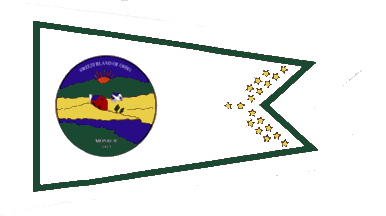 This white burgee is shaped like the Ohio Flag with two points. Inside a green border, appear 18 gold stars and a round picture of a farm scene. The picture is labeled "Switzerland of Ohio." Monroe County was organized in 1815. It was named for James Monroe who was U.S. Secretary of State at the time.