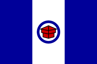 A vertical tribar of blue-white-blue with the city seal in the center, showing a silhouette of Fort Industry at sunrise behind the Maumee River. Flag adopted 18 January 1994. This flag was adopted, reusing the 1873 seal of the city, in preparation for the city's 160th anniversary.