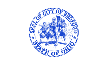The flag of the City of Bedford, Ohio is the city logo on a white flag. This information was sent to me by Michelle Gnoddie, City Manager's Office, City of Bedford, Ohio, including an image of the city logo (seal).