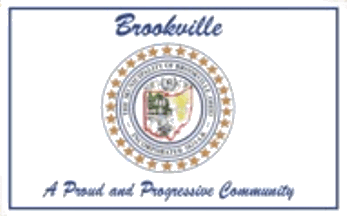A white flag with thin blue rim inside the edge and a complex city seal in the center. The city name lies above the seal and the slogan A Proud and Progressive Community lies below it. Brookville is in Montgomery County.