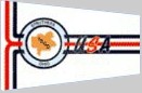[Mahoning County, Ohio, US] has an image of a flagpole bearing 3 flags- US, Ohio, and a third one, white with a gold device and some additional detail very hard to see. Fortunately there is a graphic of the third flag at the top of the page which provides a little more detail- the flag is trapezoidal like Ohio's, there is seal-like emblem set towards the hoist bearing what seems to be a gold map . Black [or maybe dark blue] and red stripes come from the top and bottom near the hoist and turn towards the fly end, going beneath the emblem, and the letters USA [black/red/black] are placed over them.
