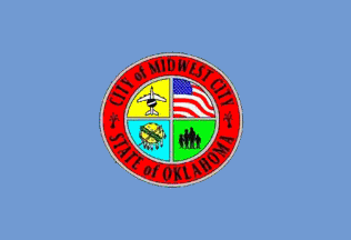 The flag of Midwest city can be seen on the city government's website, behind the photos of Mayor, councilmen, and other city leaders. The flag flies over several locations in the town also. The middle of the flag is the city seal, which includes a US flag, and a Boeing E-3 Sentry AWACS aircraft. The majority of the E-3 fleet is based at Tinker AFB which is "in" Midwest City. I was stationed there for 5 years flying many, many hours on the E-3 and spent much time in Midwest City. I can tell you the city seal is also on all police/fire patches, the side of squad cars, and posted at city buildings.