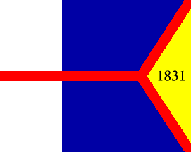 A geometric design, vertically divided 1:2 white and blue; over a red horizontal central narrow stripe, splitting into a Y shape toward the fly; a yellow triangle at fly.