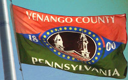 A red over green horizontal bicolor, with a blue diamond bearing the date 1800 and over that a blue ring with 31 yellow stars (or dots?) and in the center a black disk bearing an image of the roofline of a municipal building.
