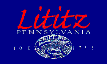 "In 1776, the Moravian town of Lititz was born. Conceived as an experiment in utopia, the village was named to honor the Bohemian town of Lidice where, in 1756, the followers of John Hus had received sanctuary from religious persecution and had formed the Moravian Church, the oldest of all Protestant denominations. It was called "Litiz." To ensure that inhabitants would be "free from all dangerous and worldly connections, and live a peaceful and quiet life in Godliness and Honesty," the Town Regulations of 1756 were adopted. Only those who signed the Regulations were allowed to live in the town. The strictness of the rules is self-evident. There was to be no "light-minded, disorderly and needless conversation, no changing of professions, no giving a night's lodging to any person or no undertaking a journey, either far or near, without permission." Furthermore, "parents shall be accountable for their children and families, and when any of them mis-behaved or do amiss, it shall be required at their hand." Even marriages were arranged. A prospective bridegroom would draw the name of his wife from a coconut shell filled with scrolls on which were written the names of eligible young women. Prohibited was all "dancing, taverning, feasting at weddings, christenings or burials, common sports and pastimes and the playing of the children in the streets.......They that have inclinations that way cannot live in Lititz." But change is inevitable. By 1856 the church found itself unable to enforce a way of life that no longer had community support. The "Rules" were abolished and the town opened to people of all religious persuasions - present day Lititz. It was "for the necessary entertainment of strangers and travellers" that in 1764 the present Inn was built and named the "Zum Anker" (the sign of the anchor). The Inn became the Lititz Springs Hotel, then the name was changed to The General Sutter Inn in 1930, to honor John Augustus Sutter, a California Gold Rush pioneer, who lived his last seven years in Lititz, and is buried in the Moravian Cemetery." General John Augustus Sutter (1803-1880) was a trader and trapper who established in April 1838 a grass hut village on the confluence of the Sacramaneto and American rivers, California. Sutter became a Mexican citizen and was granted in 1841 40,000 acres of land by the Governor of Monterey; he named the grant New Helvetia. In 1849 Sutter, recognized as the founding pioneer of California, was asked to help frame the California State Constitution as a member of the Monterey Convention. On 16 February 1853, Sutter was granted by concurrent resolution the title of Major General commanding the California Militia. After the destruction of its farm, Sutter moved to Lititz [www.generalsutterinn.com/generalsutterpage.html].In "The Lititz Record Express", 28 February 2007 [4], Michael C. Upton reports the adoption of the flag of Lititz as follows: