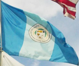 A vertical triband, blue-white-blue, with the full seal in the white field.
