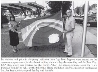 I found a photo showing the new flag for the Town of Iva, SC. Unfortunately, it is black and white and I can't say what are the colors. It is from the book "Around Iva South Carolina" by Revlva, page 116, but no year is mentioned.