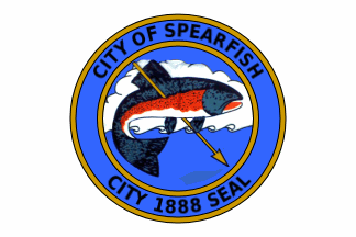 The City Administrator of the City of Spearfish, South Dakota, sent me a photo of the city flag. It is the city seal (with altered colors) on the white background.