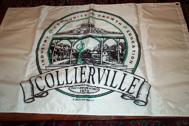 The flag was adopted in 1970. It was designed by Mrs. James Thompson with some assistance from Mrs. James Russell. The three main panels of the flag depict a factory which shows Collierville's growth in the industrial area, a bale of cotton and cows head shows the farming and dairy ties to Collierville, and the church shows the spititual interests of Collierville.
