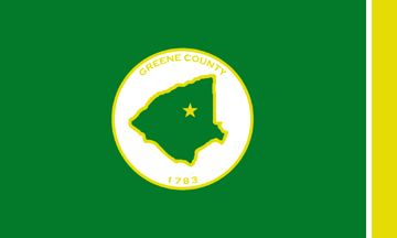A green flag bearing the seal centered, with a very narrow white vertical stripe and a wider deep yellow vertical stripe at the fly.