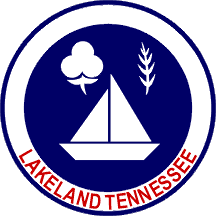 This is a very dark blue (Old Glory blue) disc with a wide white ring, itself bordered by a narrow edge of the same shade of blue. Centered on the bottom part of the ring, the lettering "Lakeland Tennessee" set in narrow sans-serif dark red capitals. On the disc, a stylized two-sail ship below a twig of fir (?) dexter, and a cotton "flower" sinister.