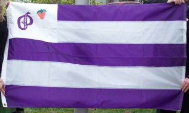The flag consists of 5 horizontal stripes lilac-white-lilac-white-lilac, and a small white canton with a strawberry and