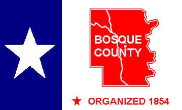 The flag of Bosque County was designed by Pete Page, a County Judge, for the twin occasions of the County Courthouse's centennial and the State's sesquicentennial in 1986. The flag has not been officially adopted. The flag has a white field with a blue stripe on the hoist. On the blue stripe is a white star. In the center of the white field is a red map of the county, with the words BOSQUE COUNTY in white. The words ORGANIZED 1854 appear at the bottom of the flag in red along with a red five-pointed star.
