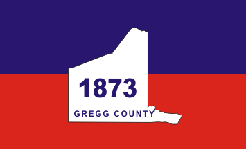 The Gregg County flag was designed by Dr. Black and adopted by the Commissioners Court in 1989. The flag was modeled after the Texas flag, with a red field on the bottom and a blue field on top. In the center of the flag is a white silhouette of Gregg County, with blue lettering of the county's name and 1873, the year Gregg County was organized.